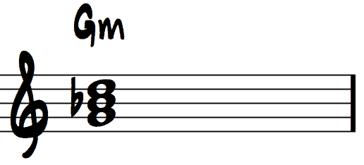 To find the notes of the G minor chord, we have to remember the notes of the G major chord, G, B and D. To transform the G major chord into a G minor chord, you have to flatten the third degree, B becomes Bb. The G minor chord is composed of G, Bb and D.
