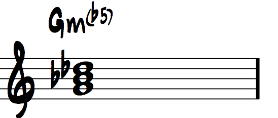 To find the notes of the G minor b5 chord, you need to remember the notes of the G major chord, G, B and D. We start by flattening the third degree, which transforms the major chord into a minor chord, B becomes Bb. Then we flatten the fifth degree to make the chord minor b5, D becomes Db. The G minor b5 chord is composed of G, Bb and Db.
